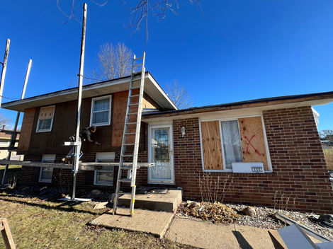This customer had a tornado pass through their neighborhood overnight. First thing in the morning our crew set out to help around his area. He'd decided to hire us for our emergency blue tarping services, and we ended up battling his insurance company for him as well. After a long ordeal, the insurance company finally decided to do the right time and cover this homeowners property at a FAIR market value - which isn't what they would normally pay. We then ended up remodeling his whole exterior, including roofing, siding, windows, chimney, and patio door, and we will soon be rebuilding his two car garage!